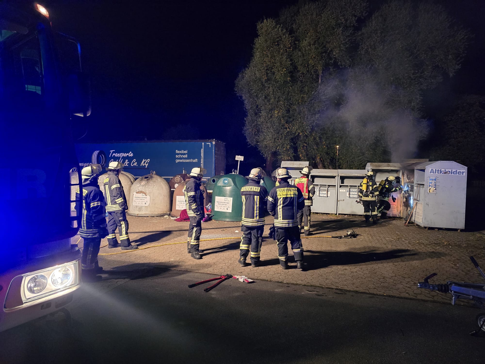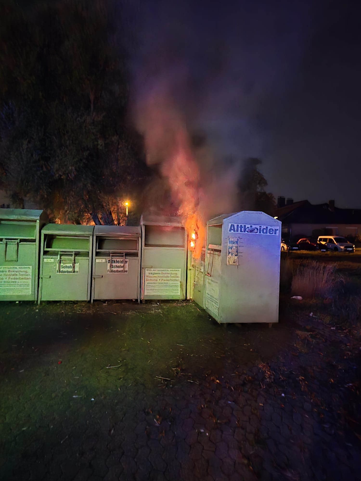 Beim Eintreffen der Einsatzkräfte brannten zwei Altkleidercontainer. Die Container wurden durch einen Trupp unter schwerem Atemschutz mit Werkzeug geöffnet und entleert, der Inhalt der Container auseinander gezogen und das Feuer so schnell gelöscht.