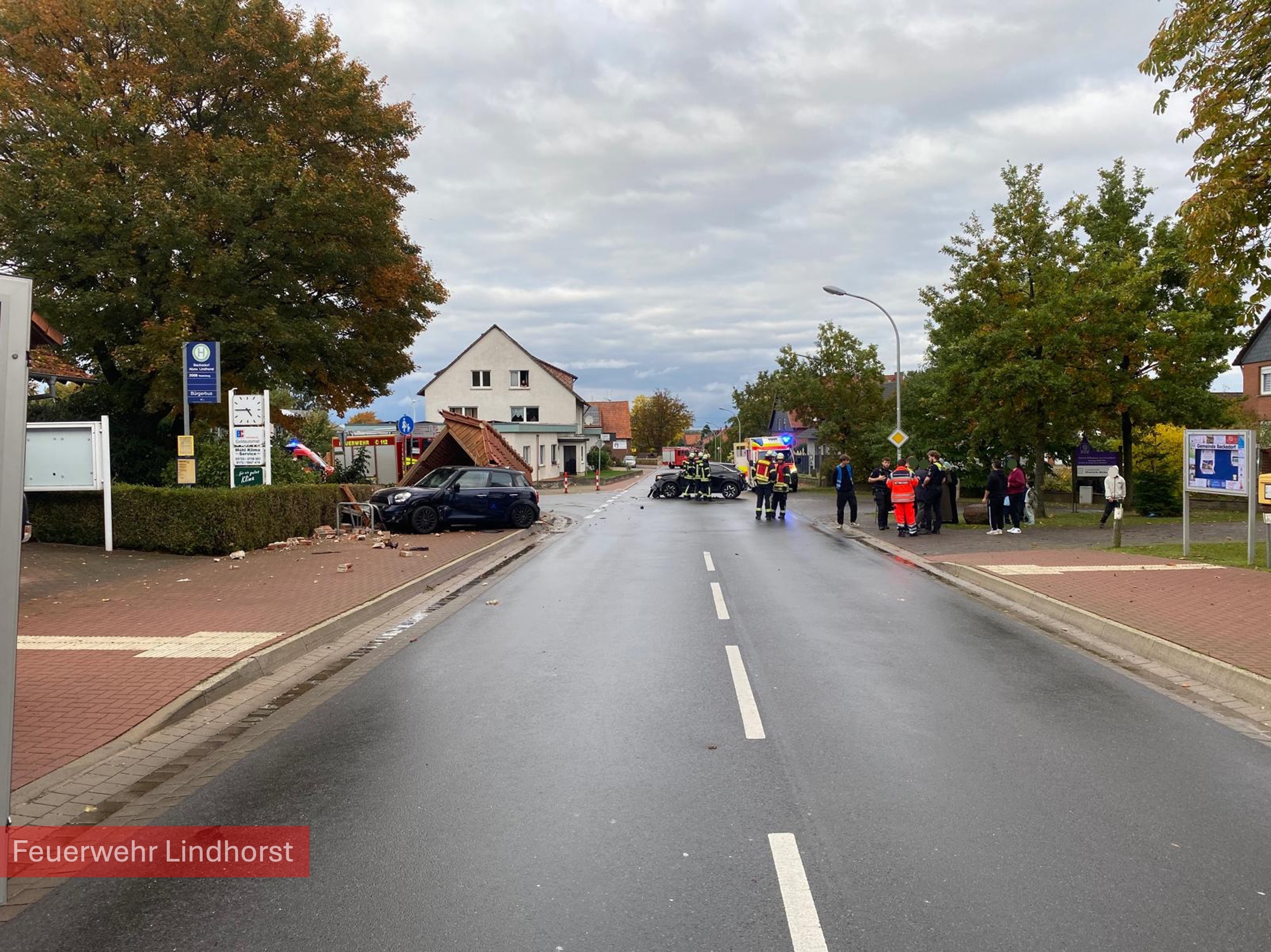 Eines der Unfallfahrzeuge wurde durch den Zusammenstoß in ein gemauertes Buswartehäuschen geschleudert und brachte dieses zum Einsturz, glücklicherweise befand sich zum Zeitpunkt des Unfalls niemand in dem Häuschen.