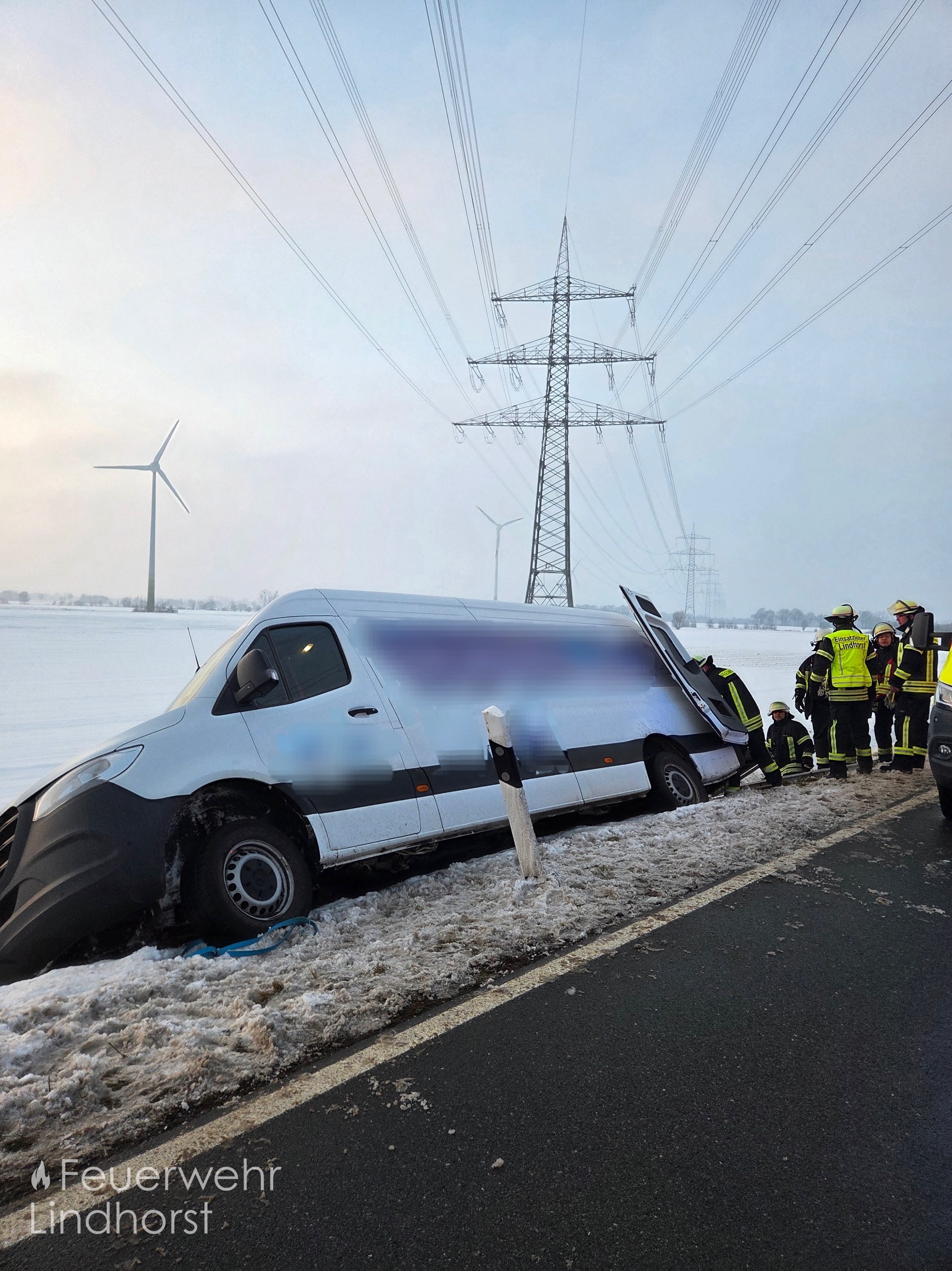 Beim Eintreffen stellte sich heraus, dass ein Transporter von der Fahrbahn abgekommen war und seitlich im Straßengraben zum Stillstand gekommen war. Im Fahrzeug befanden sich vier Personen. Der Fahrer konnte sich selbstständig aus dem Transporter befreien, drei weitere Personen waren jedoch nicht in der Lage, das Fahrzeug eigenständig zu verlassen.
