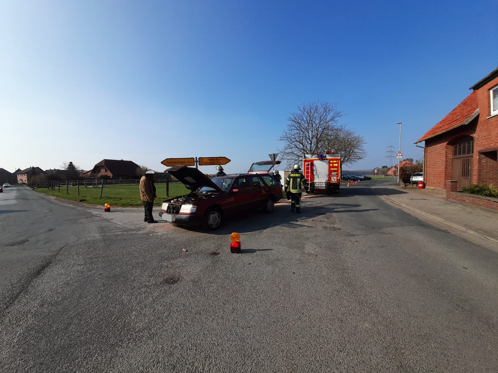 Die Einsatzstelle lag in unmittelbarer Nähe zum Feuerwehrhaus, sodass die Einsatzkräfte bereits kurz nach der Alarmierung an der Einsatzstelle eintrafen. Zu dem Zeitpunkt war weder ein Feuer, noch eine Rauchentwicklung aus dem Fahrzeug feststellbar. Der PKW stand mit geöffneter Motorhaube auf der Straße, auf der Fahrbahn konnten kleinere Öltropfen festgestellt werden.