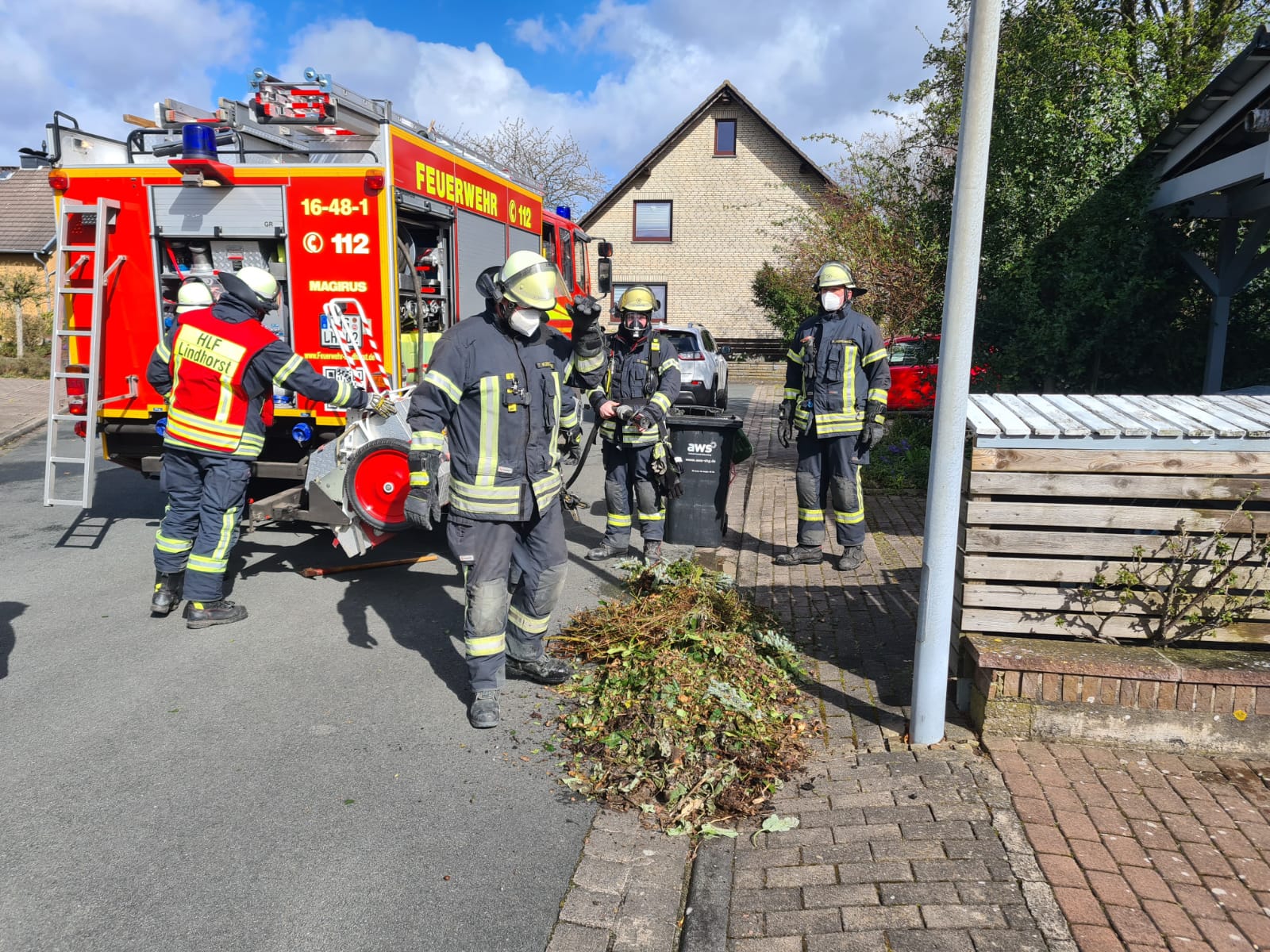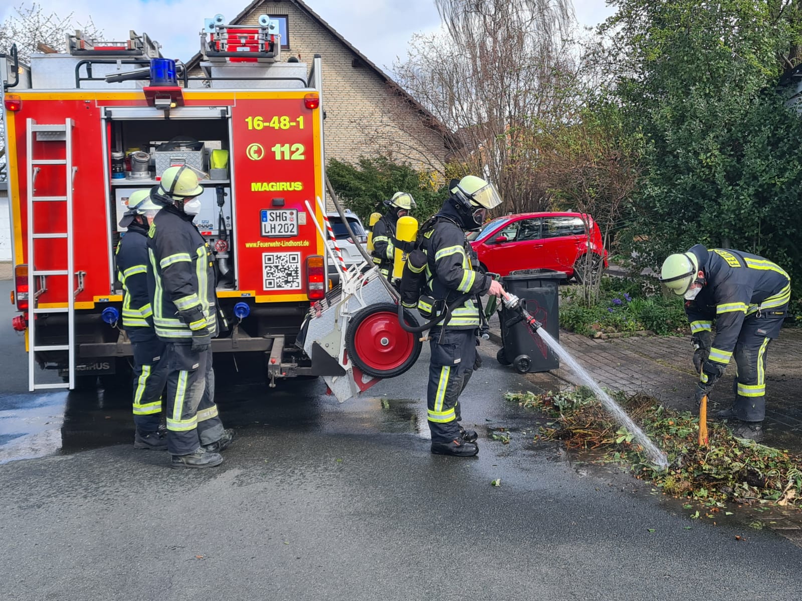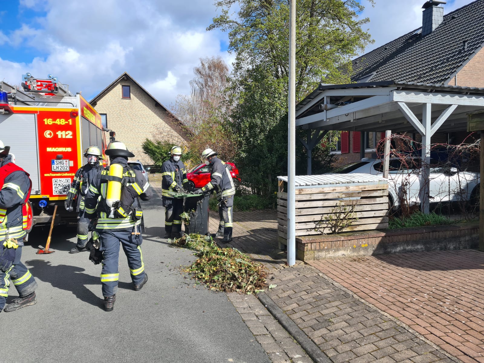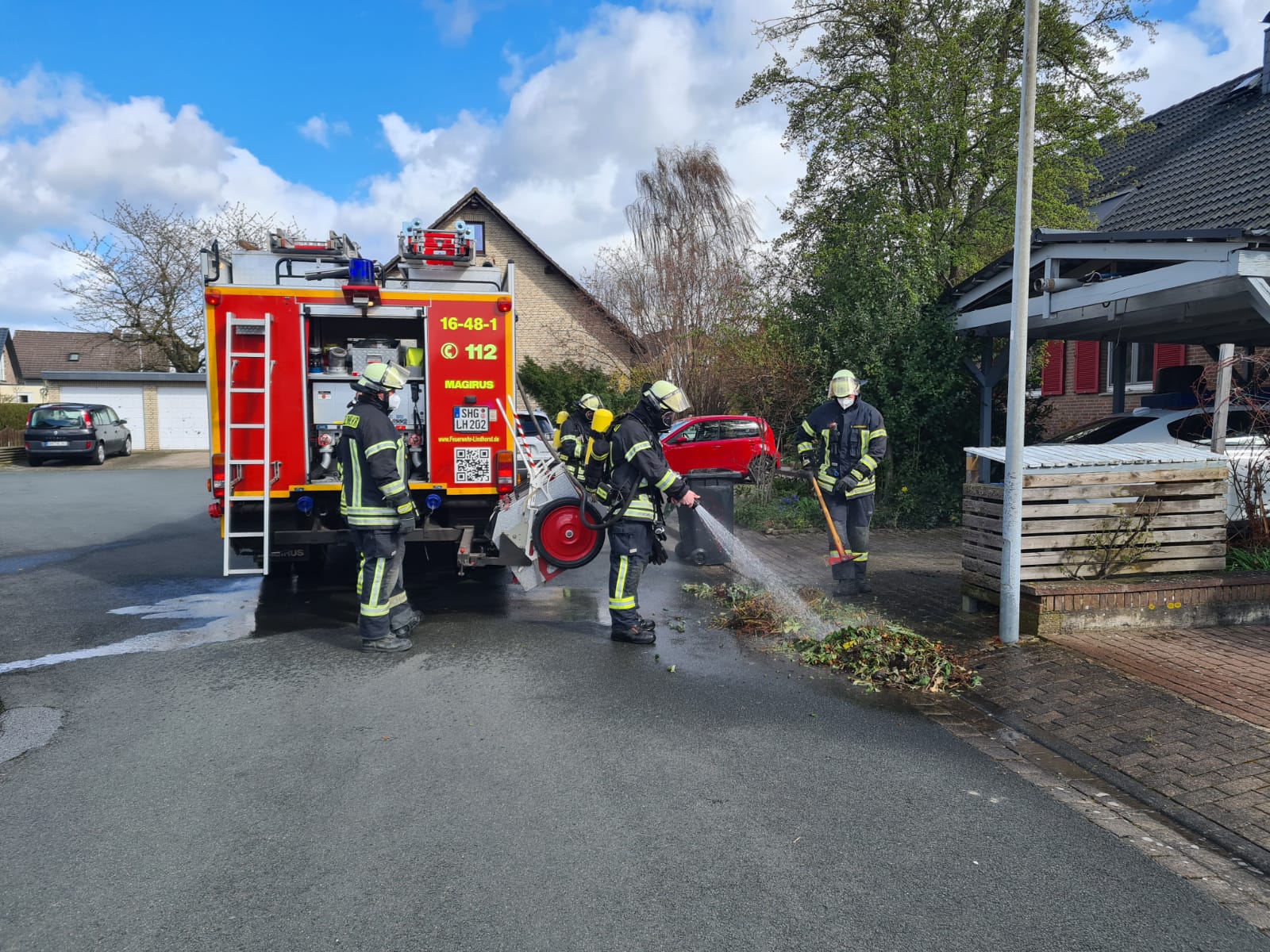 Dank des berherzten und schnellen Eingreifens des Anwohners und der ehrenamtlichen Einsatzkräfte konnte verhindert werden, dass das Feuer auf einen Holzunterstand für Mülltonnen sowie ein Carport mit einem darunter abgestellten Elektroauto übergreifen konnte.