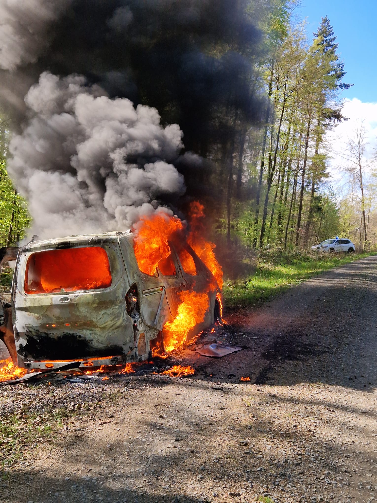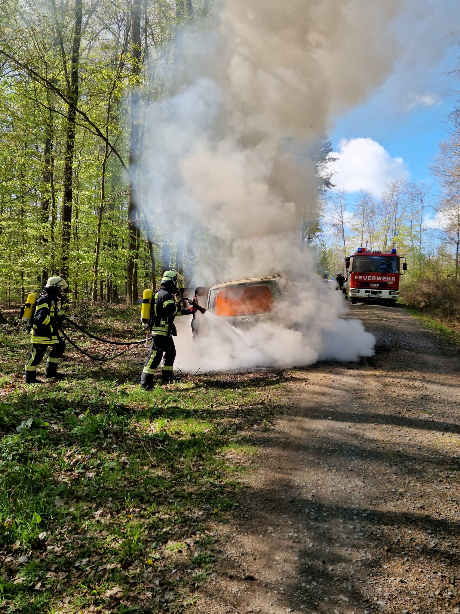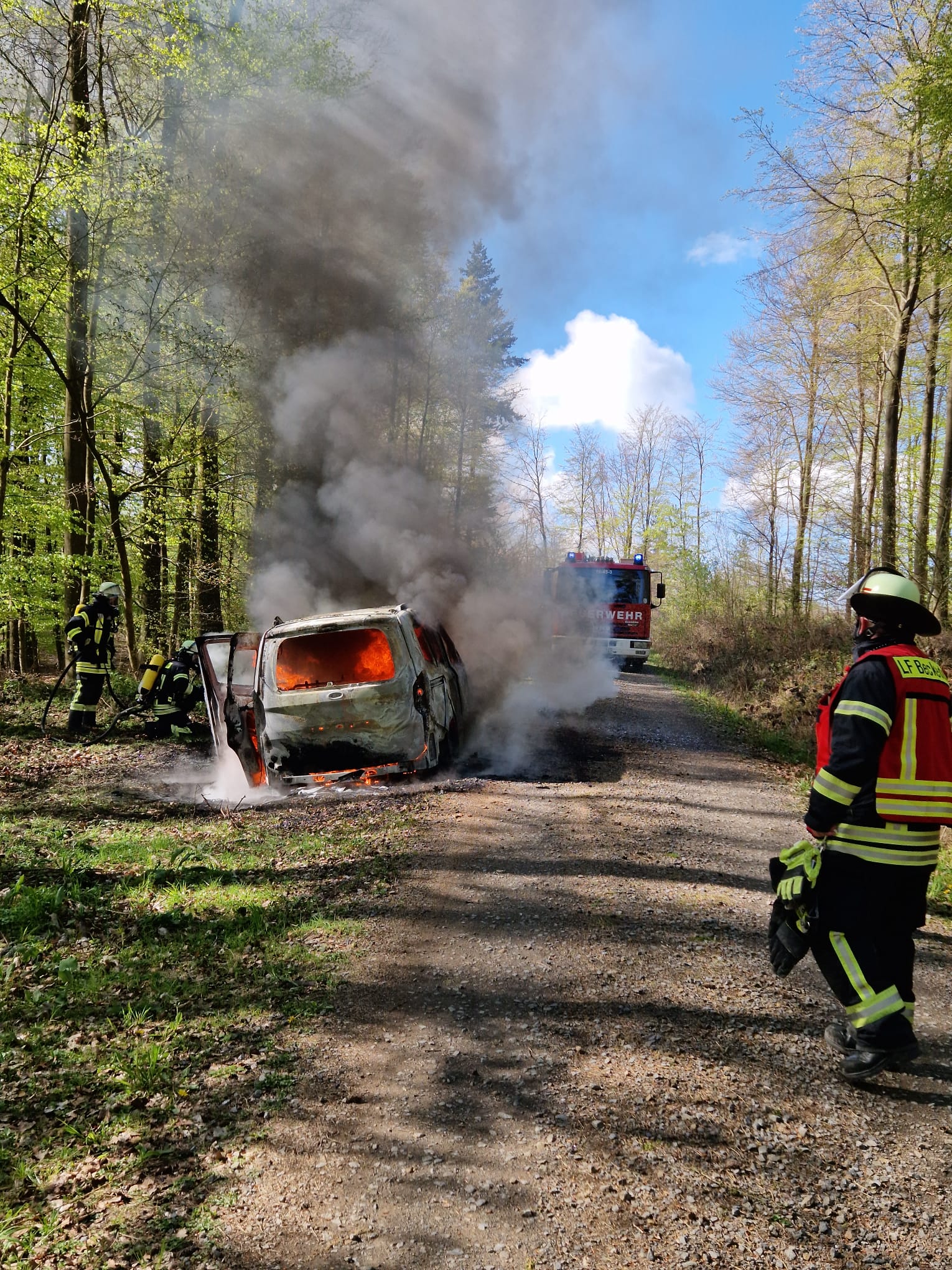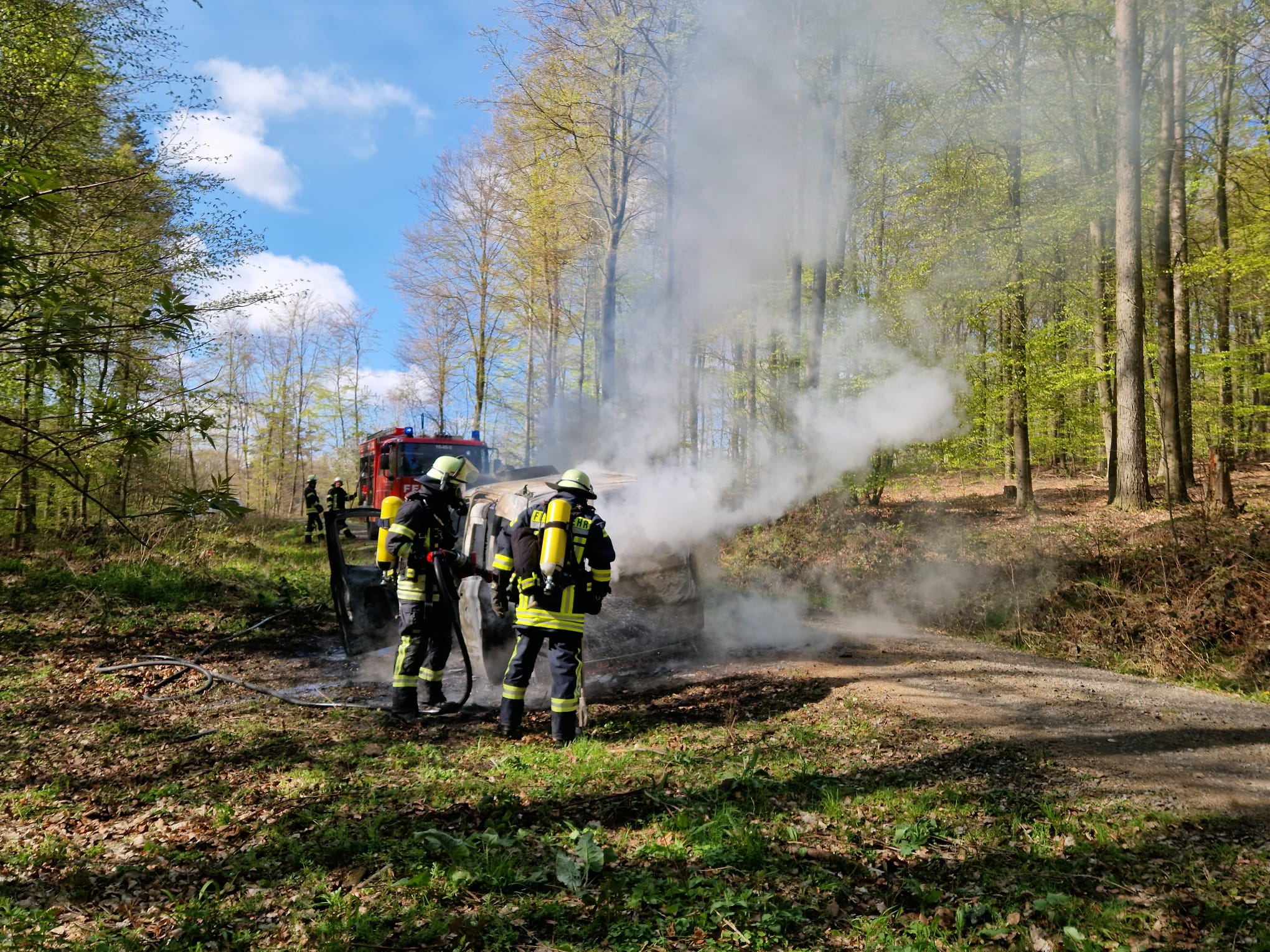 Die Einsatzstelle befand sich mitten im Wald und bei Eintreffen der ersten Einsatzkräfte stand der PKW bereits in Vollbrand. Die Rauchentwicklung konnten die Einsatzkräfte bereits auf ihrer Anfahrt von Lindhorst aus sehen.