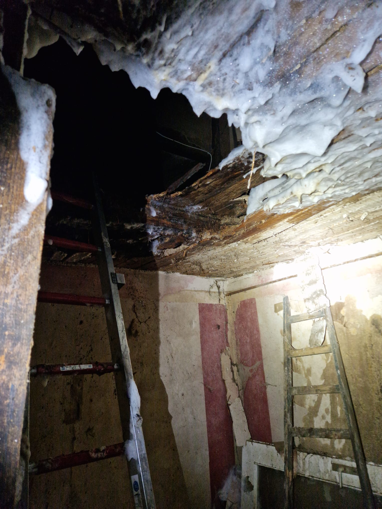 Einsatzkräfte gingen unter schwerem Atemschutz in den betroffenen Bereich vor und konnten die Ursache für die starke Rauchentwicklung zügig ausfindig machen. Es kam zu einem Schwelbrand an der Außenwand der Scheune sowie in der Zwischendecke. Insgesamt vier Trupps unter Atemschutz wurden eingesetzt, um die Glutnester abzulöschen, dazu musste die Zwischendecke mit Brechwerkzeug geöffnet werden, um auch tieferliegende Glutnester zu erreichen. Die Einsatzkräfte setzten für die Löscharbeiten neben Wasser auch Schaummittel und eine Wärmebildkamera ein, um die betroffenen Bereiche ausfindig machen zu können.