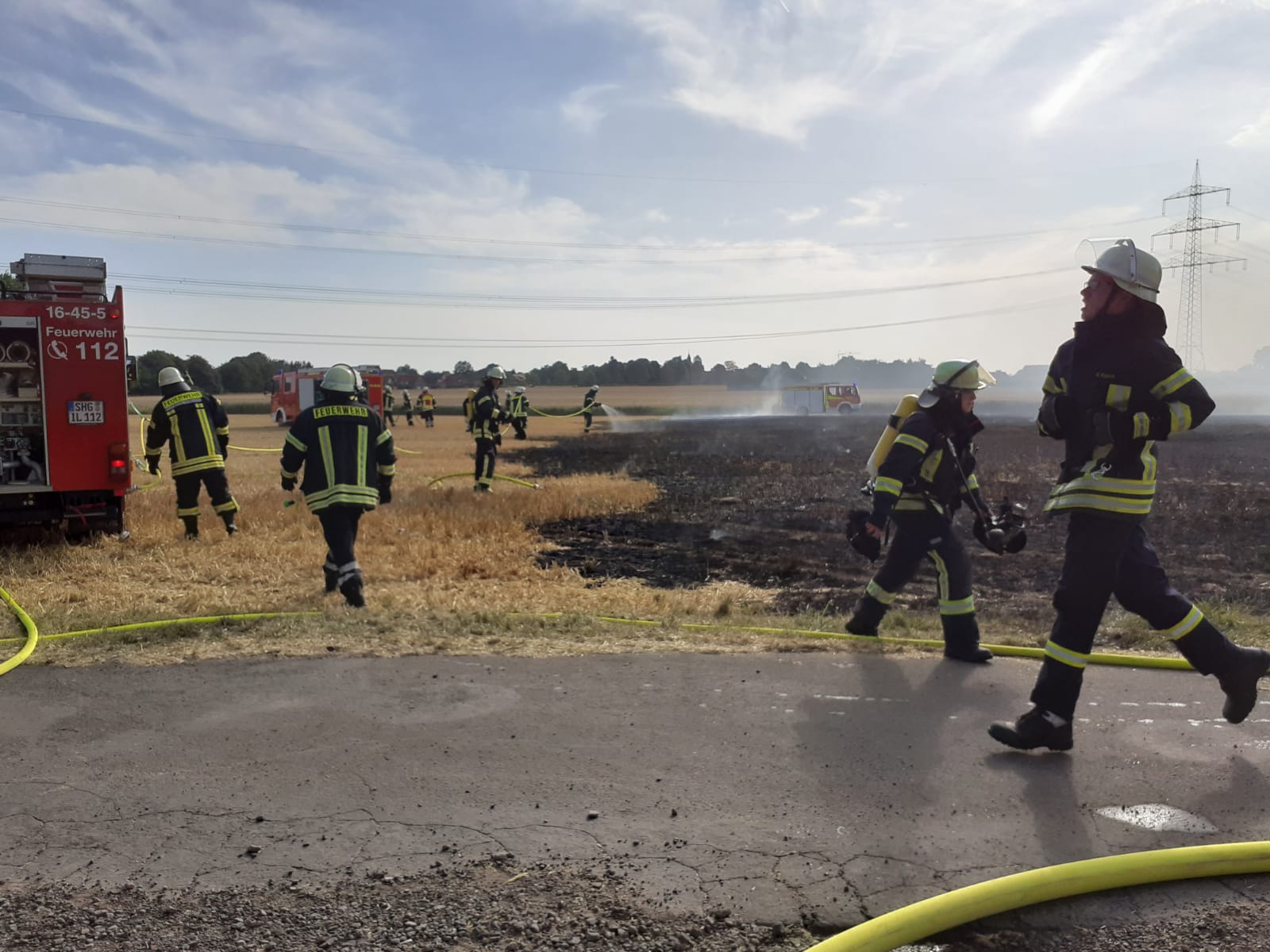 Vor Ort brannte ein Feld, das bereits auf eine Hecke übergegriffen hat und auch ein Wohnhaus gefährdete. Umgehend leiteten die Feuerwehren eine Brandbekämpfung ein, um eine weitere Brandausbreitung zu verhindern und das Wohnhaus zu schützen. Eine Gartenhütte und eine Hecke wurde dabei in Mitleidenschaft gezogen.