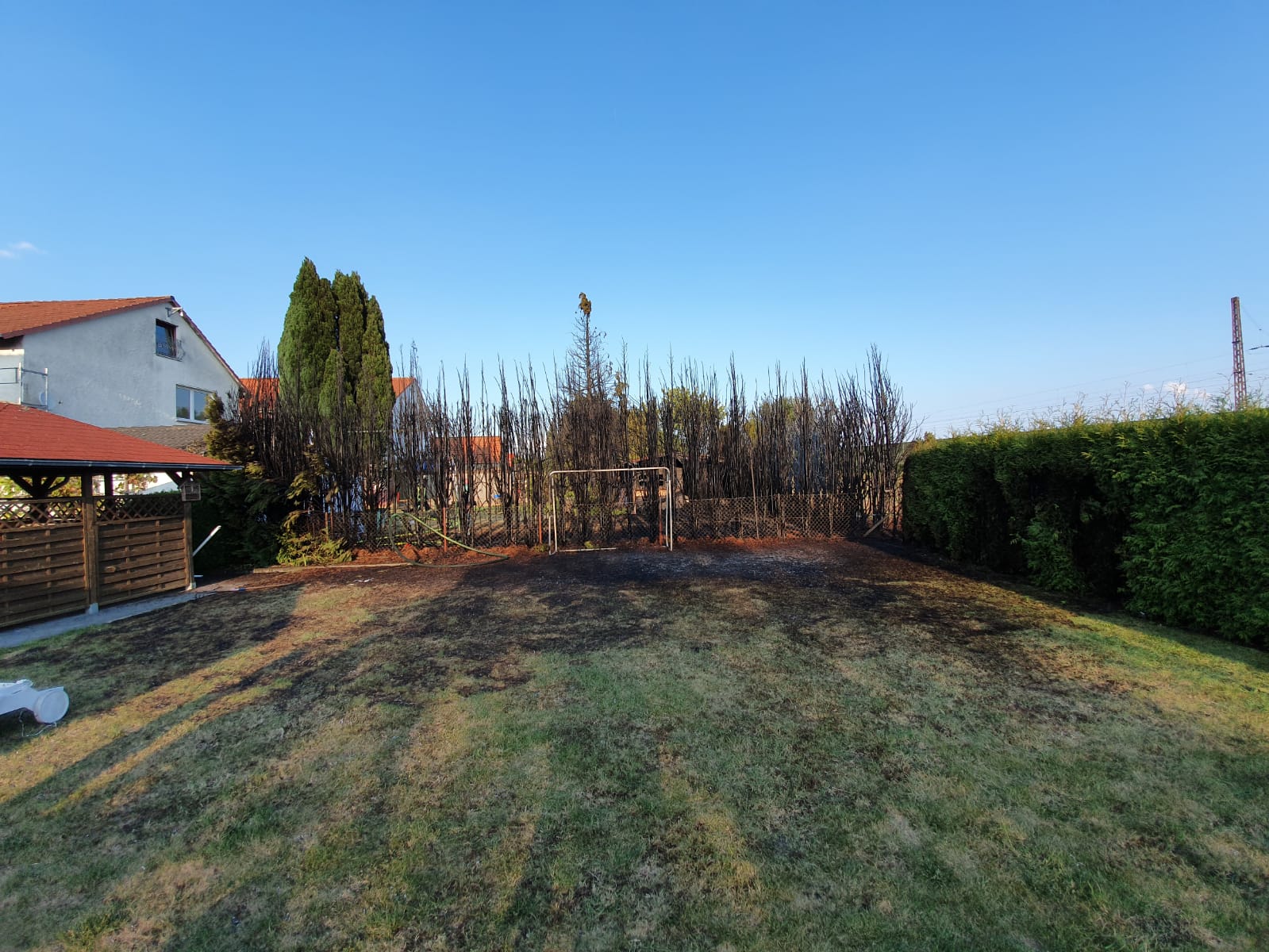 Beim Eintreffen der Einsatzkräfte an der Einsatzstelle brannte eine ca. 4m hohe Hecke auf einer Länge von 30 Metern.