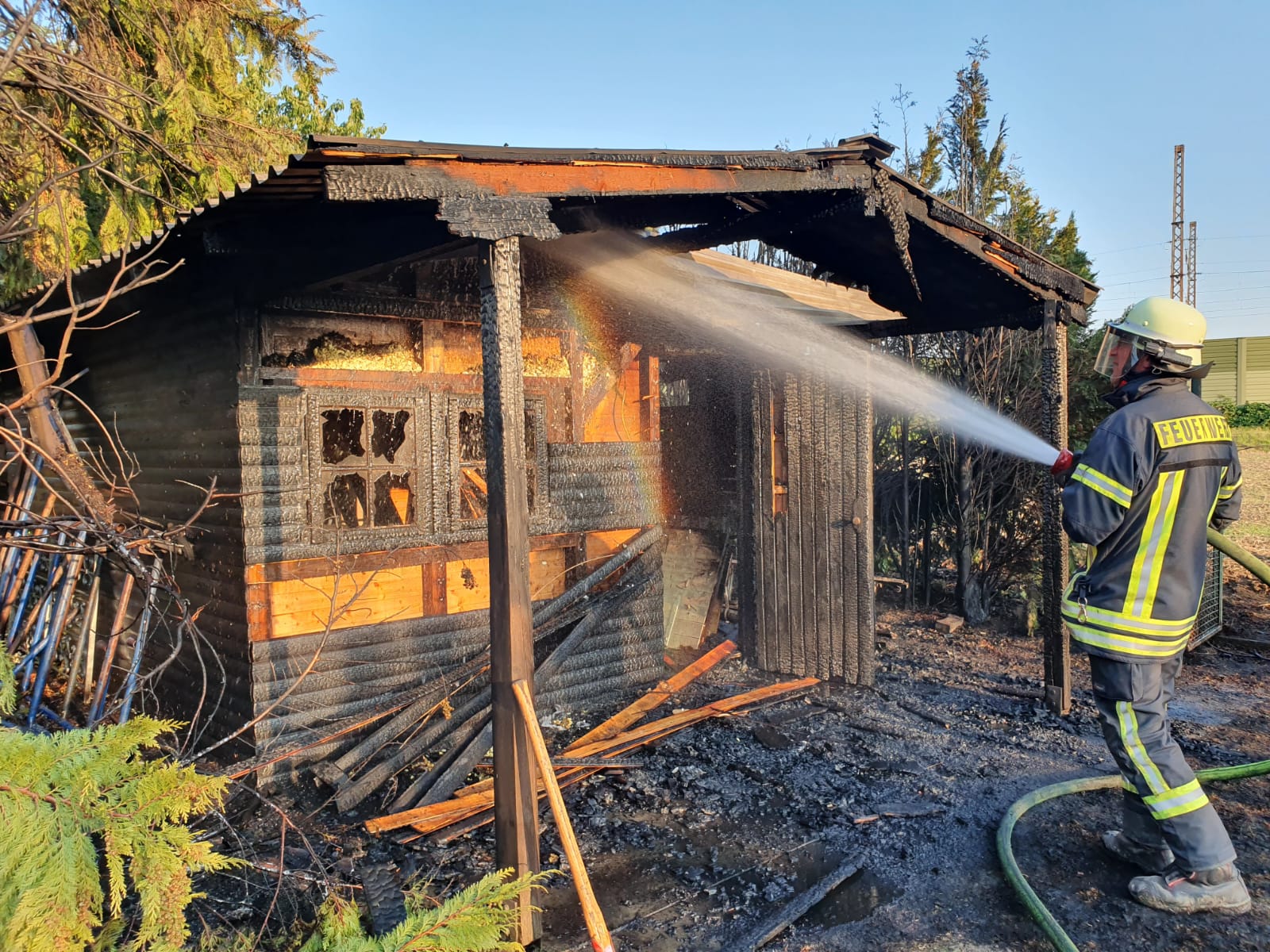 Da sich das Feuer, angefacht vom Wind, sehr schnell ausbreitete und dieses bereits auf angrenzende Nachbargrundstücke sowie eine Gartenhütte übergriff, wurde durch die Einsatzkräfte zügig mit der Brandbekämpfung mittels zwei C-Rohren begonnen.