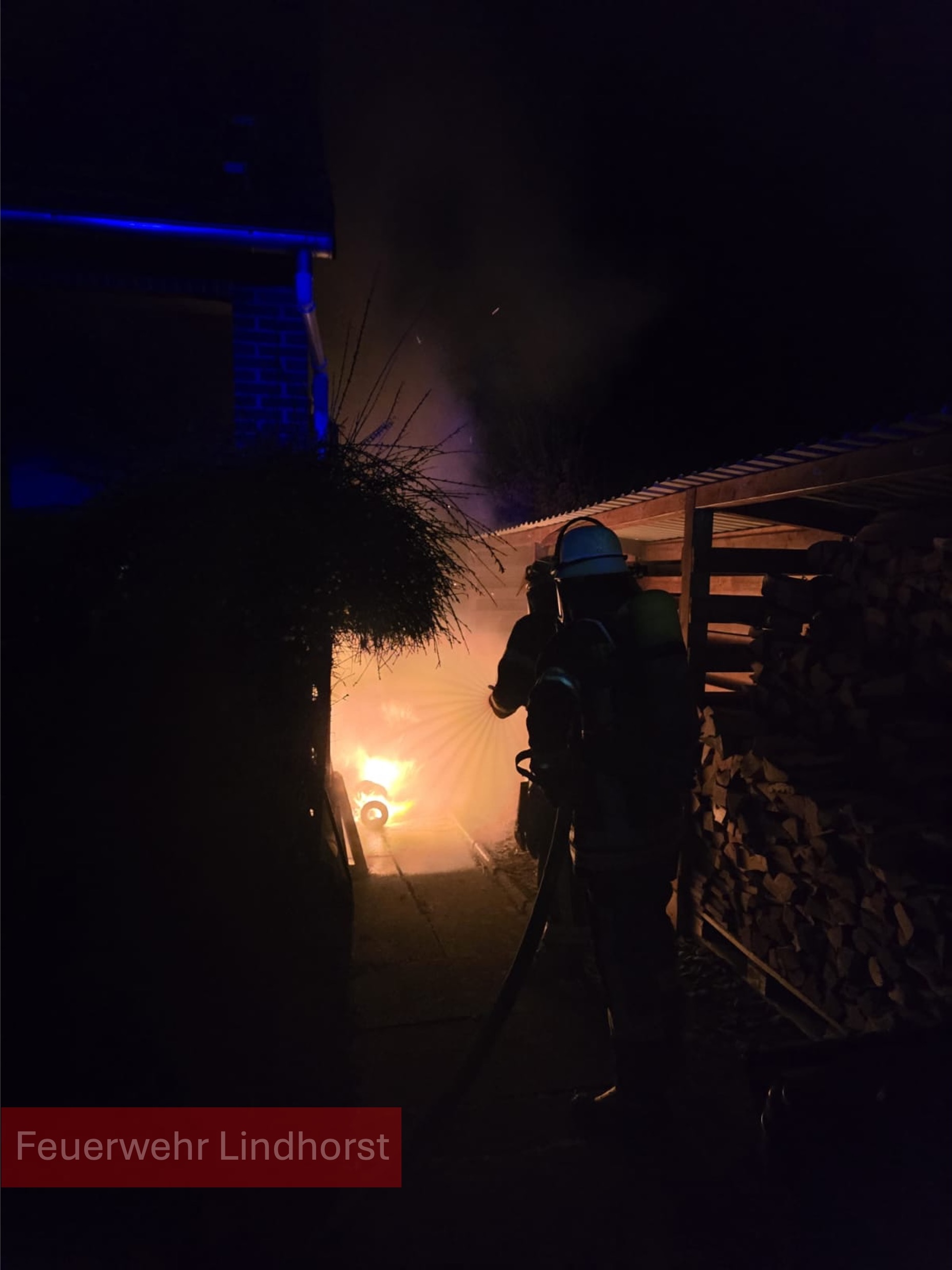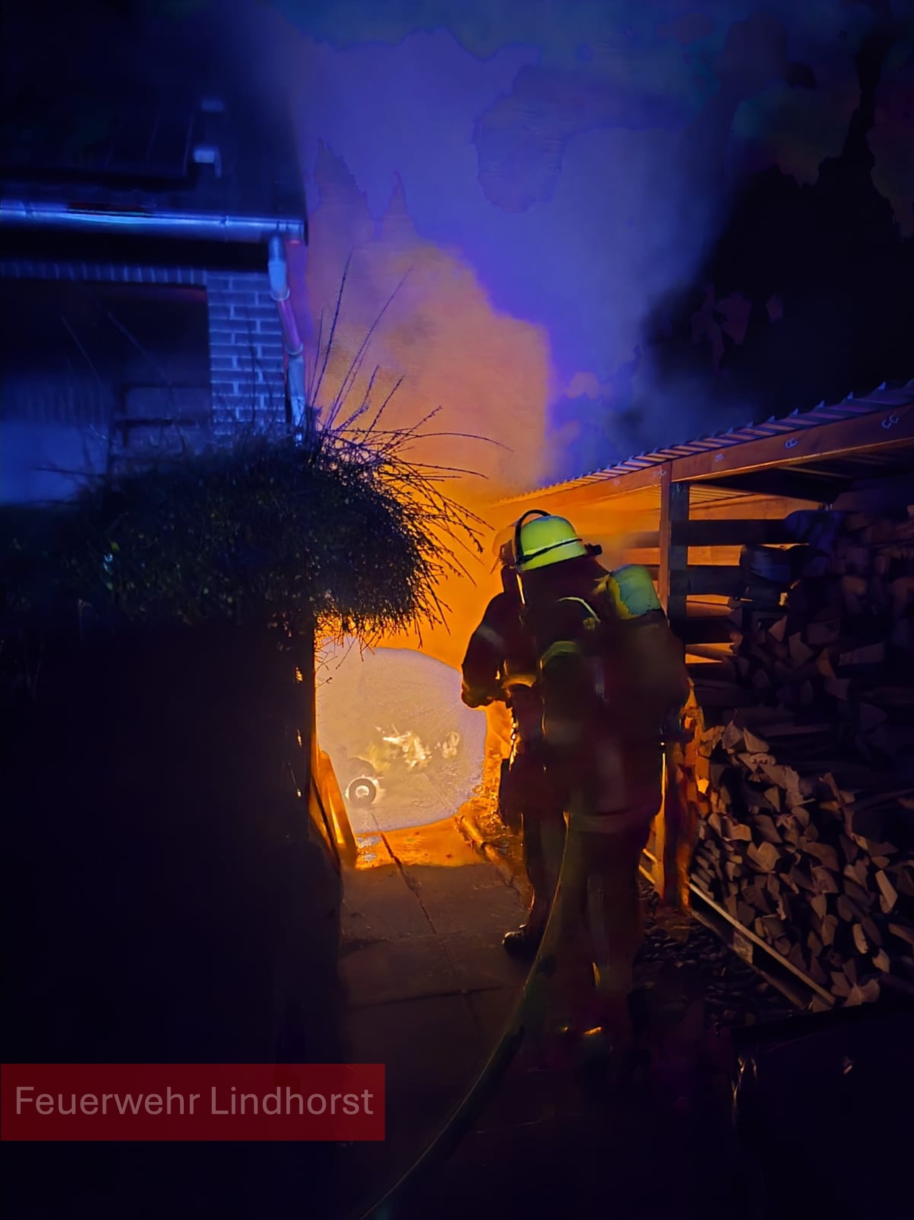 Bereits kurze Zeit später erlangte die Rettungsleitstelle weitere Informationen, dass das es ein Feuer an der Wand eines Wohnhauses geben würde, es überzugreifen drohe und ein Holzunterstand ebenfalls in gefährlicher Nähe zum Feuer stehen würde, weshalb das Alarmstichwort erhöht und damit zusätzlich die Feuerwehren Beckedorf und Heuerßen alarmiert wurden.