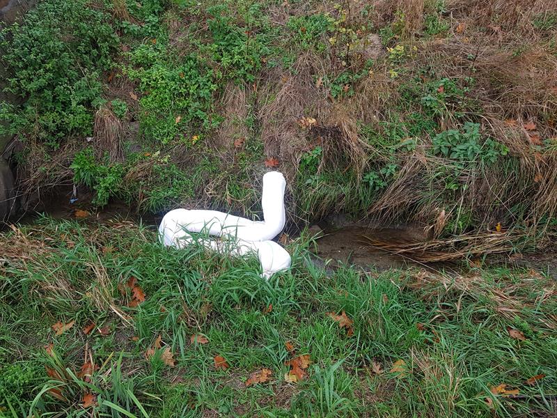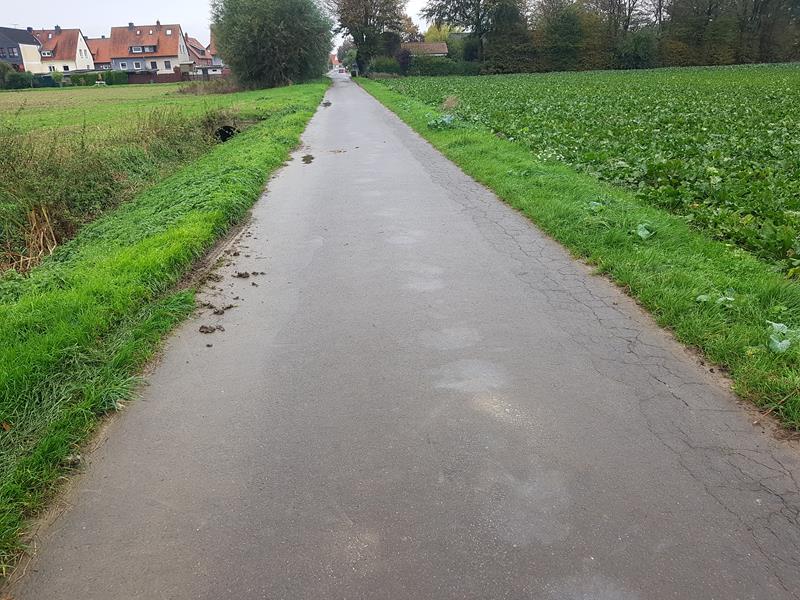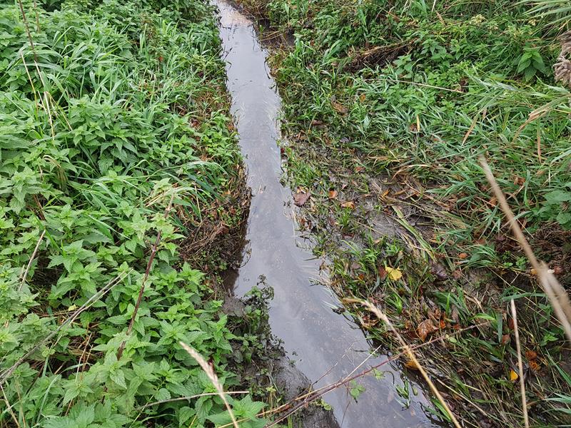 Die Verunreinigung auf dem Bach erstreckte sich beginnend auf Höhe des Freibades rund 300 Meter in Richtung Hauptstraße und verlief weiter auf den nach links fortlaufenden Grenzbach bis zu einer Überführung an einem weiteren Feldweg.