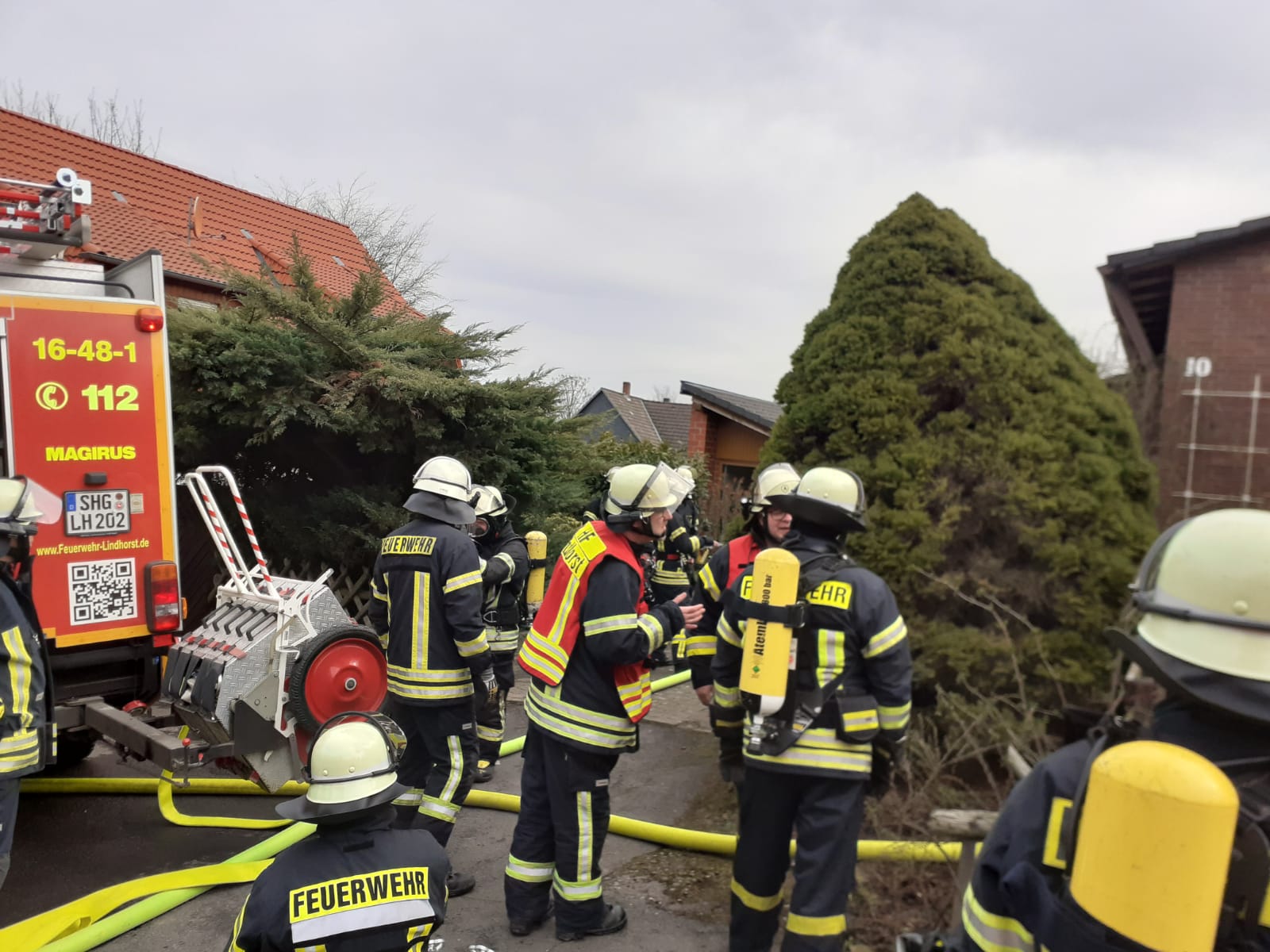 Ein Trupp der Feuerwehr Lindhorst begab sich unverzüglich nach dem Eintreffen unter schwerem Atemschutz in die Wohnung, um die vermisste Person zu suchen und eine Menschenrettung durchzuführen.