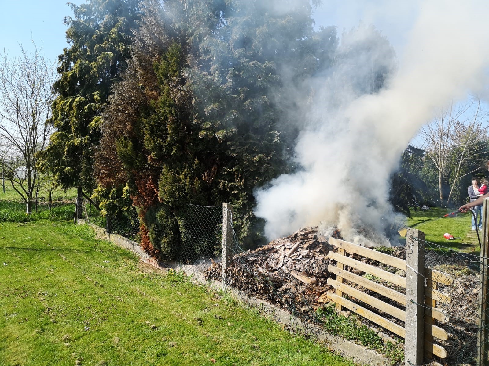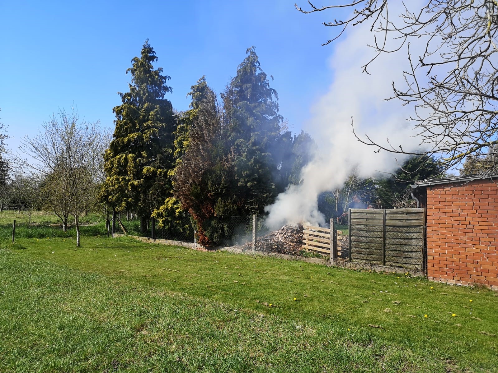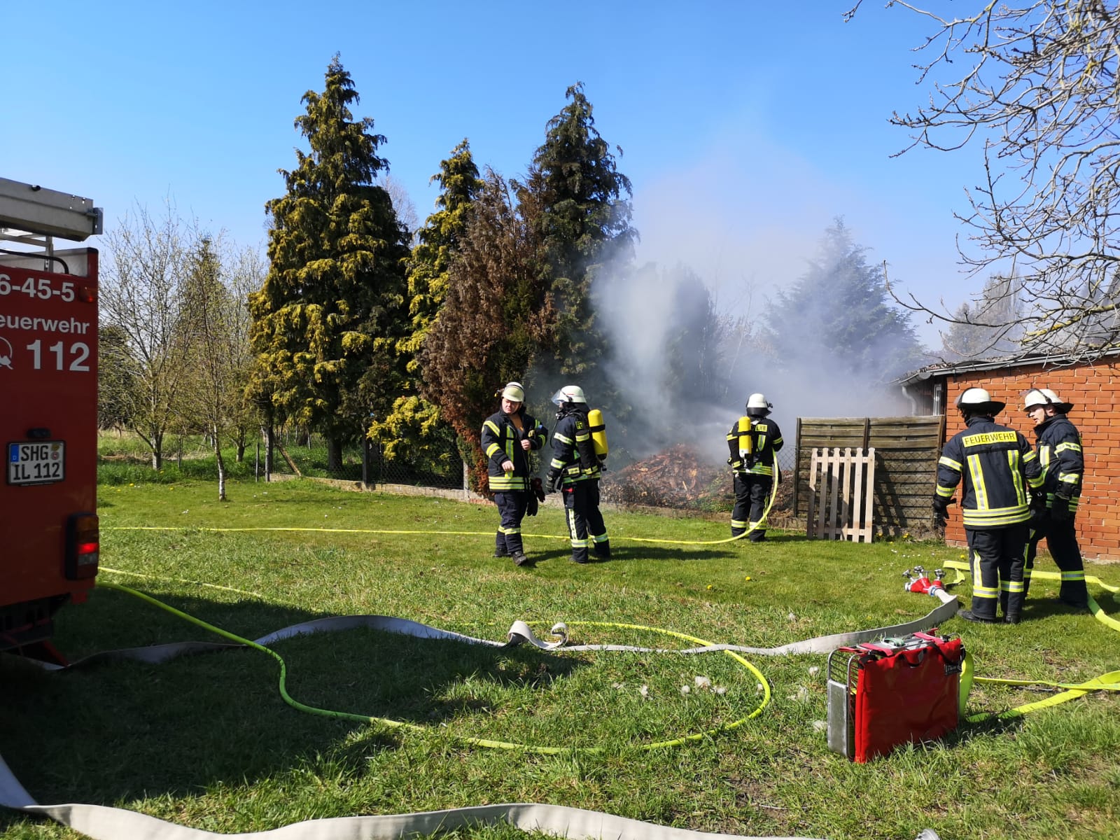 Vor Ort brannte ein Komposthaufen, der vermutlich durch heiße Asche entzündet wurde. Dieser konnte durch die Einsatzkräfte mit einem D-Rohr schnell abgelöscht werden. Eine weitere Brandausbreitung, insbesondere auf angrenzende Bäume, konnte so verhindert werden.