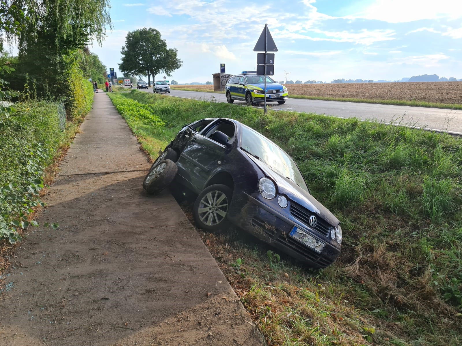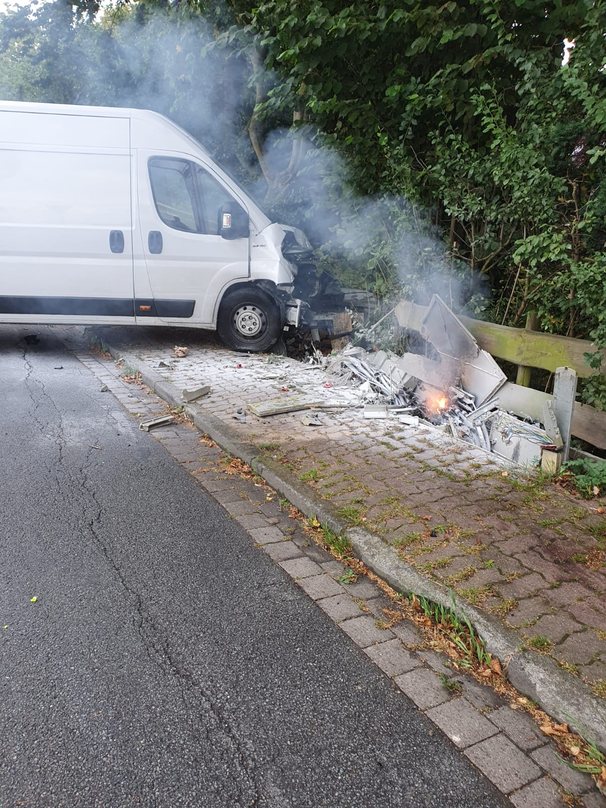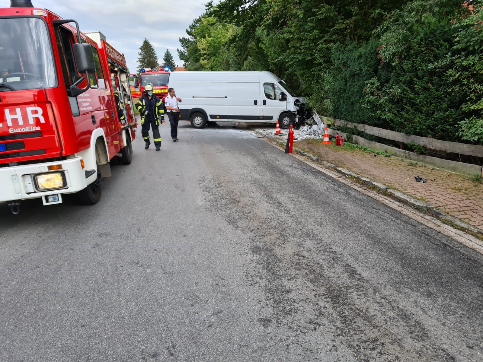 In einem Kreuzungsbereich kam es zu einer Kollision von zwei Fahrzeugen. Durch den Aufprall kam eines der Fahrzeuge in einem Straßengraben zum Liegen, das andere, ein Transporter, fuhr in einen Gartenzaun und beschädigte dabei einen Verteilerkasten, der daraufhin Feuer fing.