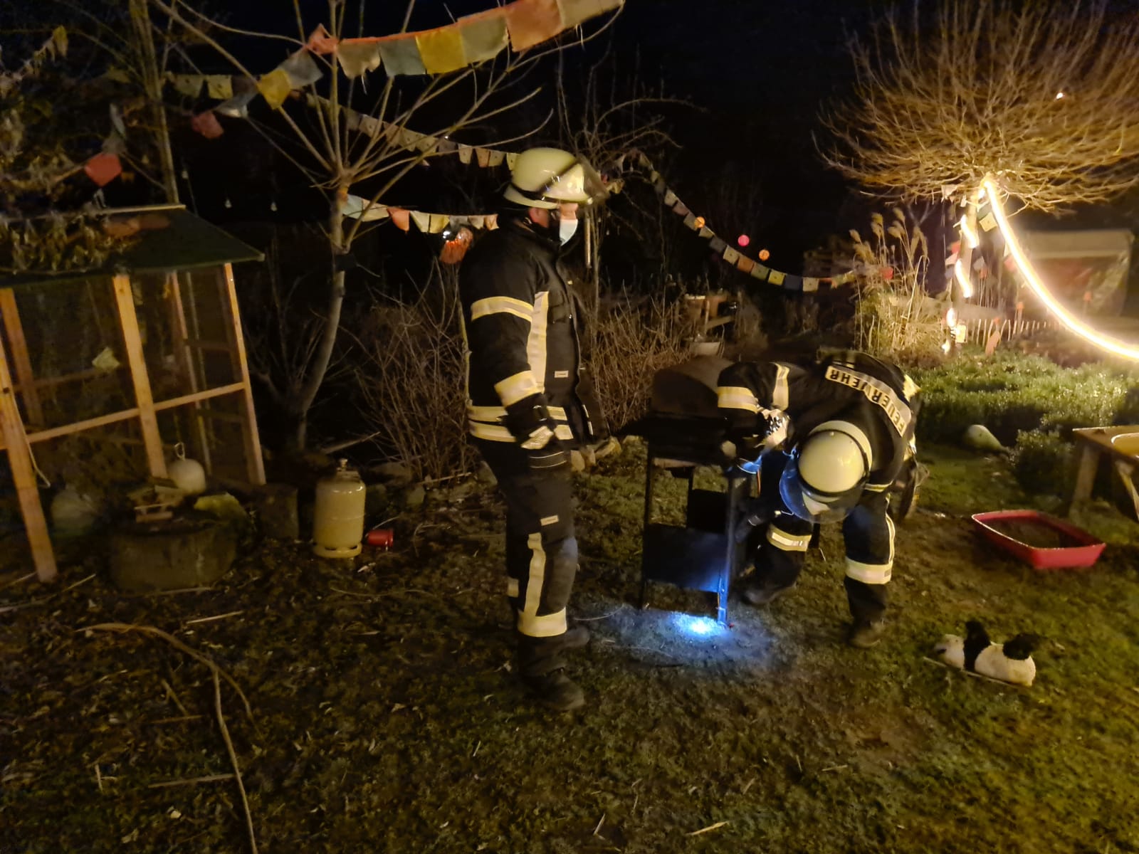 Ein Gasgrill, der unter einem Holzunterstand stand, ist in Brand geraten. Die Bewohner alarmierten die Feuerwehr und unternahmen einen Löschversuch, mit dem die Flammen erfolgreich gelöscht werden konnten.